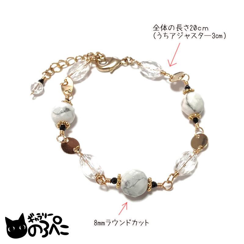 ブレスレットの長さ約20cm(うちアジャスター約3cm) / ハウライトの直径約0.8cm / 金具はゴールドカラーです