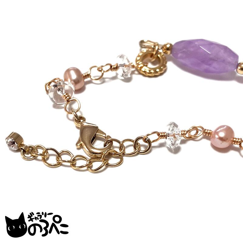 ラベンダーアメジスト3粒のブレスレット(ラベンダーアメジスト&ボタンカット水晶&ピンク淡水パールの天然石ブレスレット) aa458-746