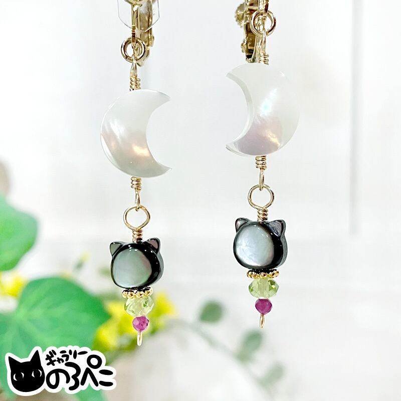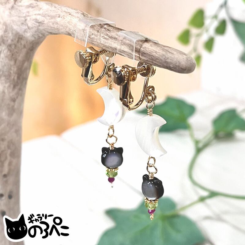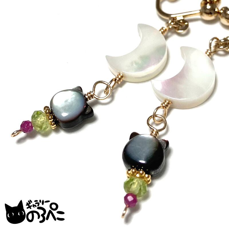 三日月と黒猫のイヤリング(シェルとペリドットとルビーの黒猫と三日月マザーオブパールがきらめく天然石イヤリング) aa458-817