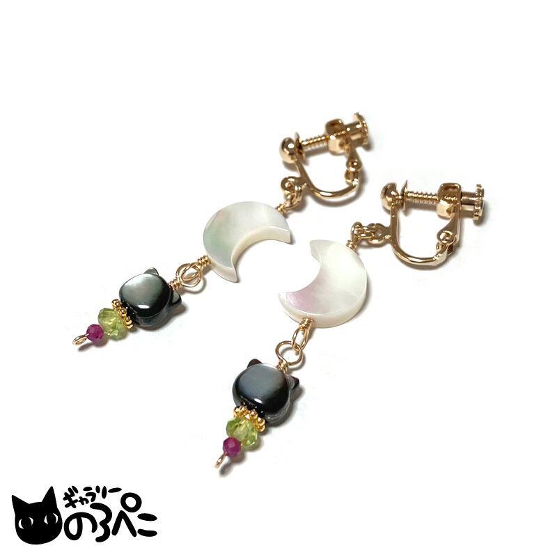 黒蝶貝(猫)、マザーオブパール(三日月)、天然石(ルビー・ペリドット)、ワイヤー、ネジバネ式イヤリング金具