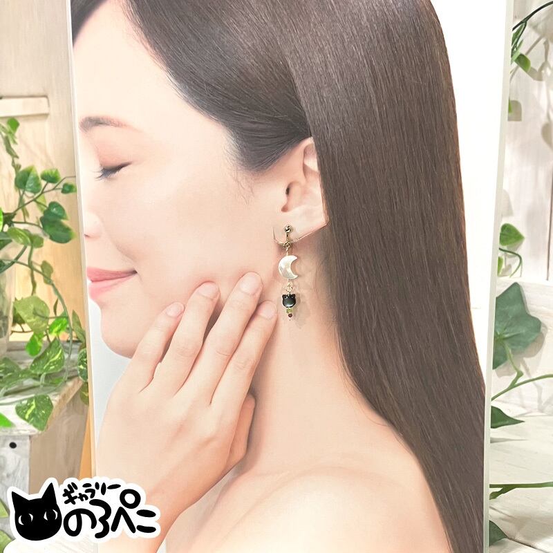 三日月の形のマザーオブパールの下で黒蝶貝のネコがゆらゆら揺れるイヤリングです。