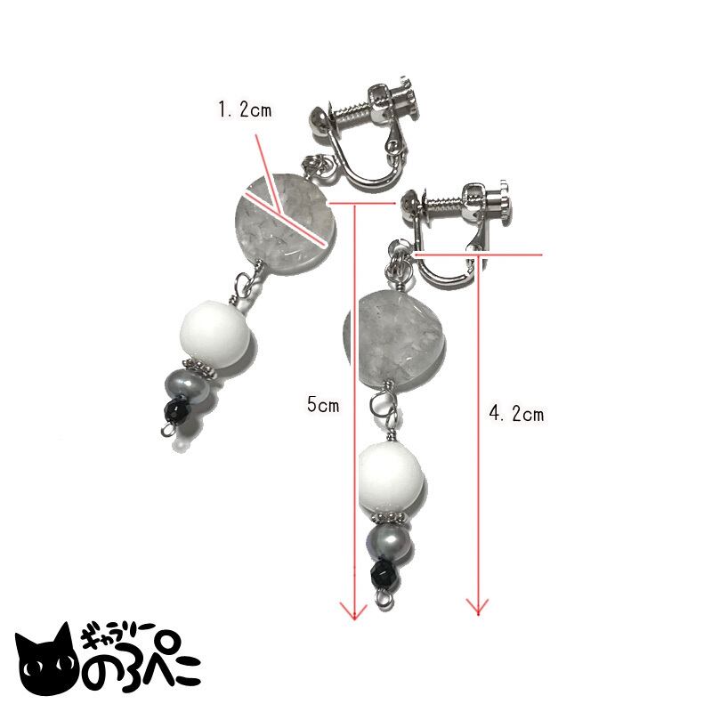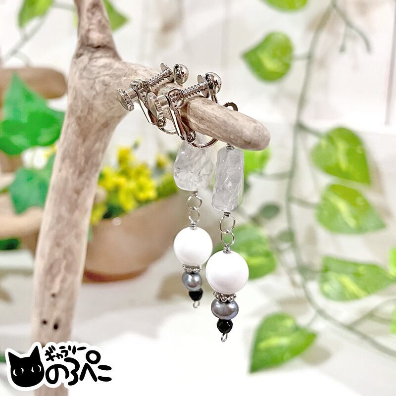 天然石(グレークォーツ・ホワイトオニキス・オニキス)、淡水パール(メタリックネイビー)、ワイヤー、メタルビーズ、ネジバネ式イヤリング金具