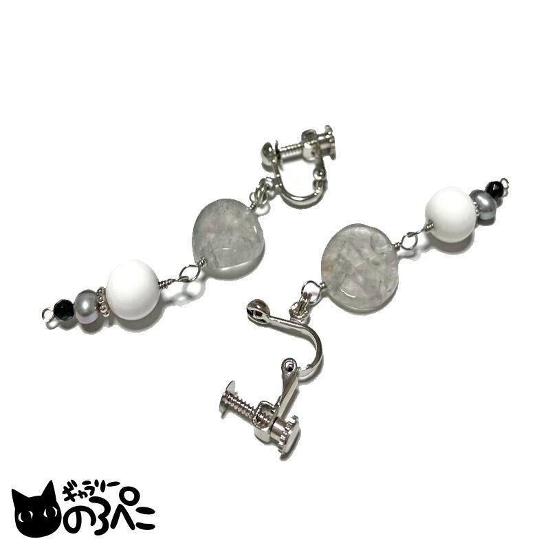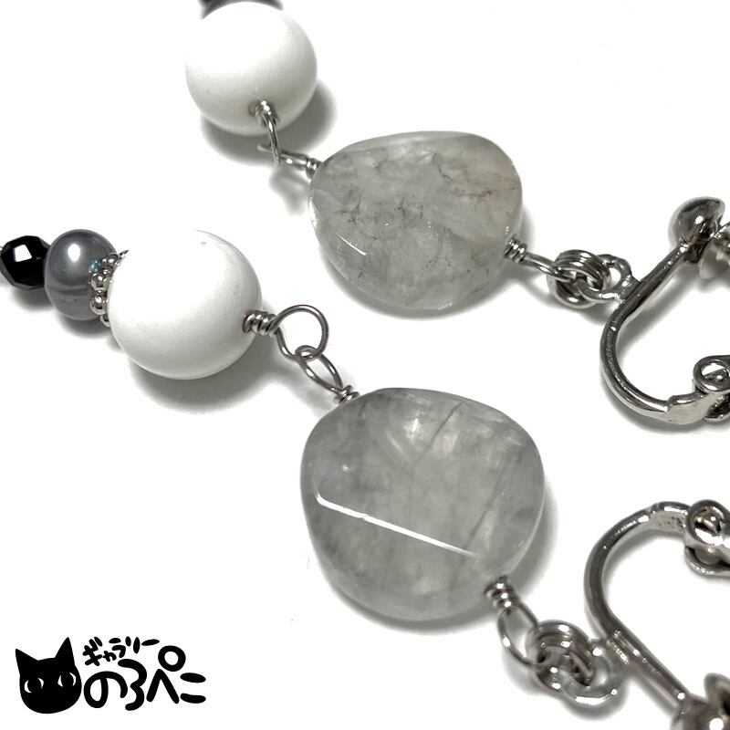 グレークォーツとブラック&ホワイトオニキスと淡水パールのイヤリング(上品に輝くモノトーンの天然石イヤリング) aa458-711