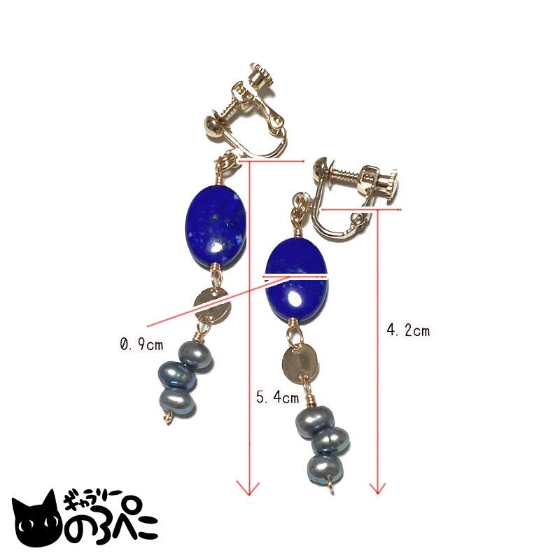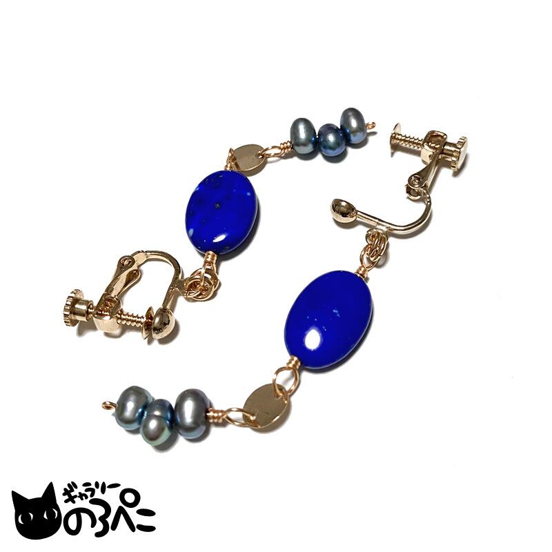 天然石(ラピスラズリ)、淡水パール、メタルプレート、ネジバネ式イヤリング金具