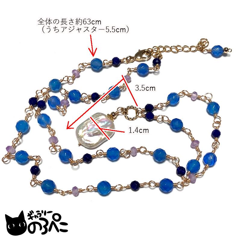 レクタングル型(長方形)の芥子パールをトップモチーフにして、ネック部分はブルーアゲート(染め)とラピスラズリ、淡いパープルのラベンダーアメジストを丁寧にメガネ留めでつなぎました。