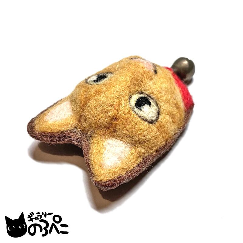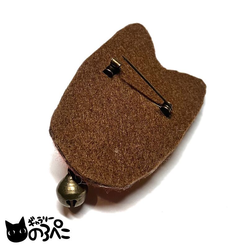 下地のフェルト生地に羊毛を刺し固め、首輪に鈴をつけています。裏側は少し硬めのハードフェルトを貼り付け、ブローチピン(ひっかけ式)を付けています。